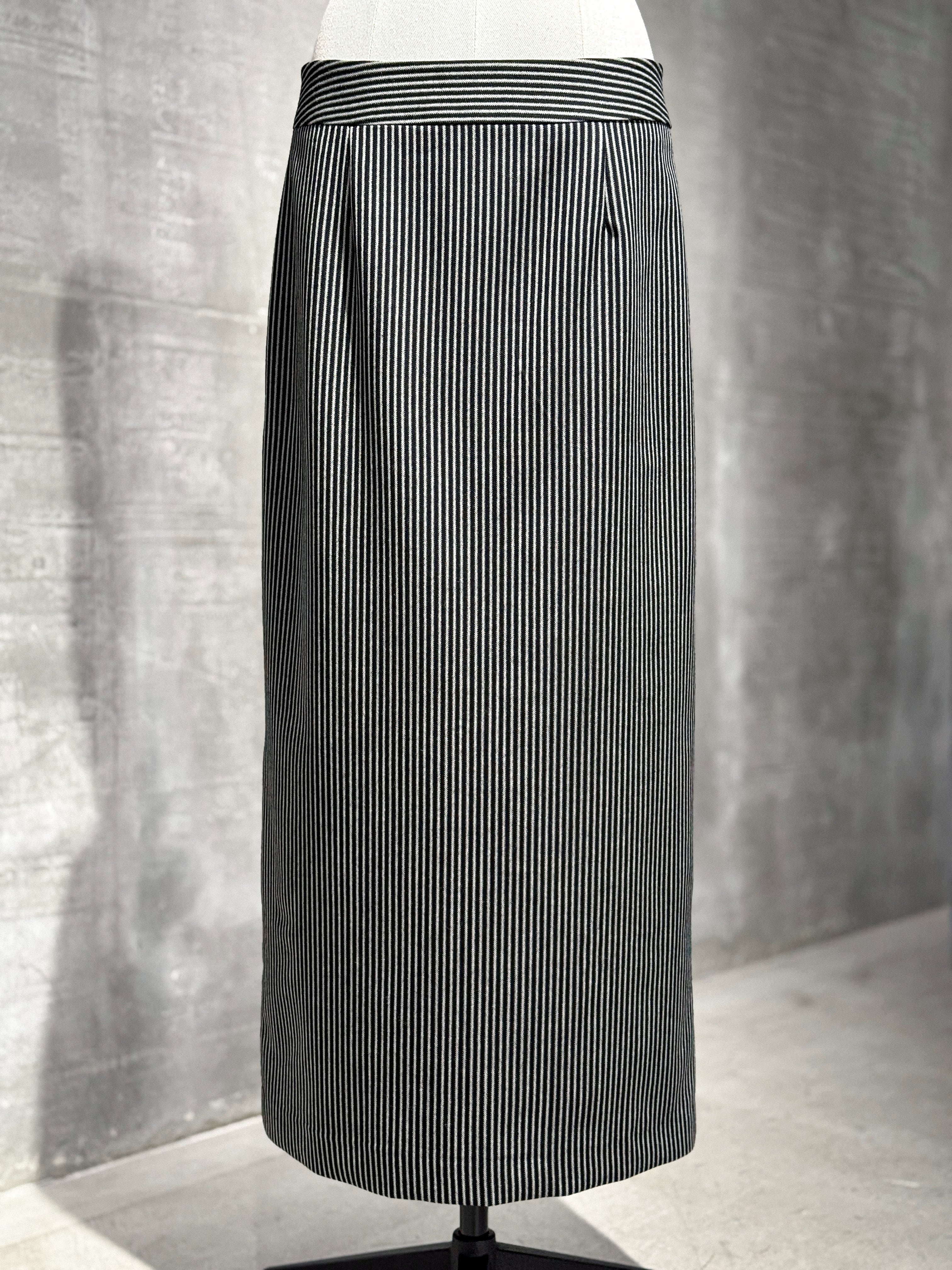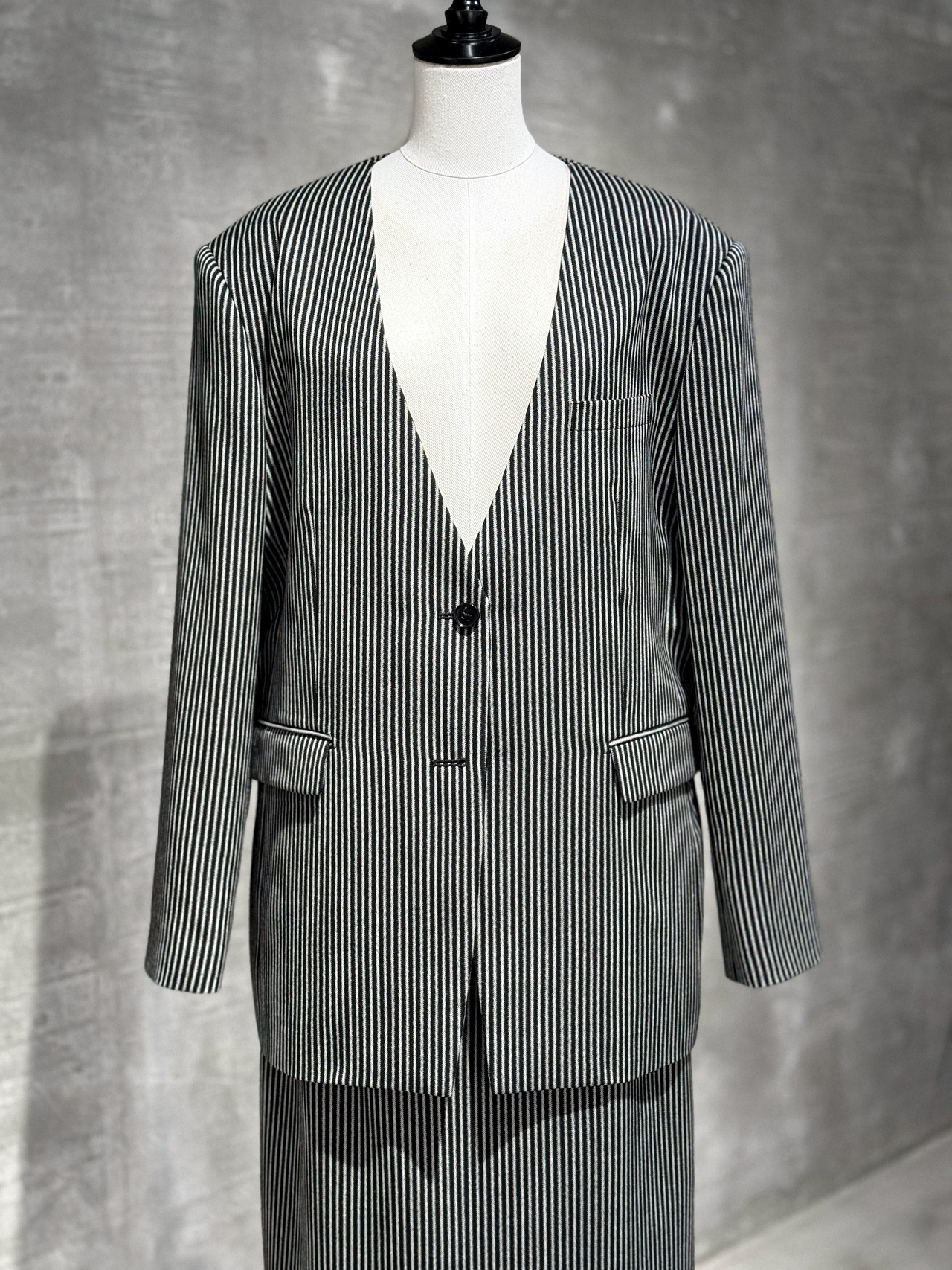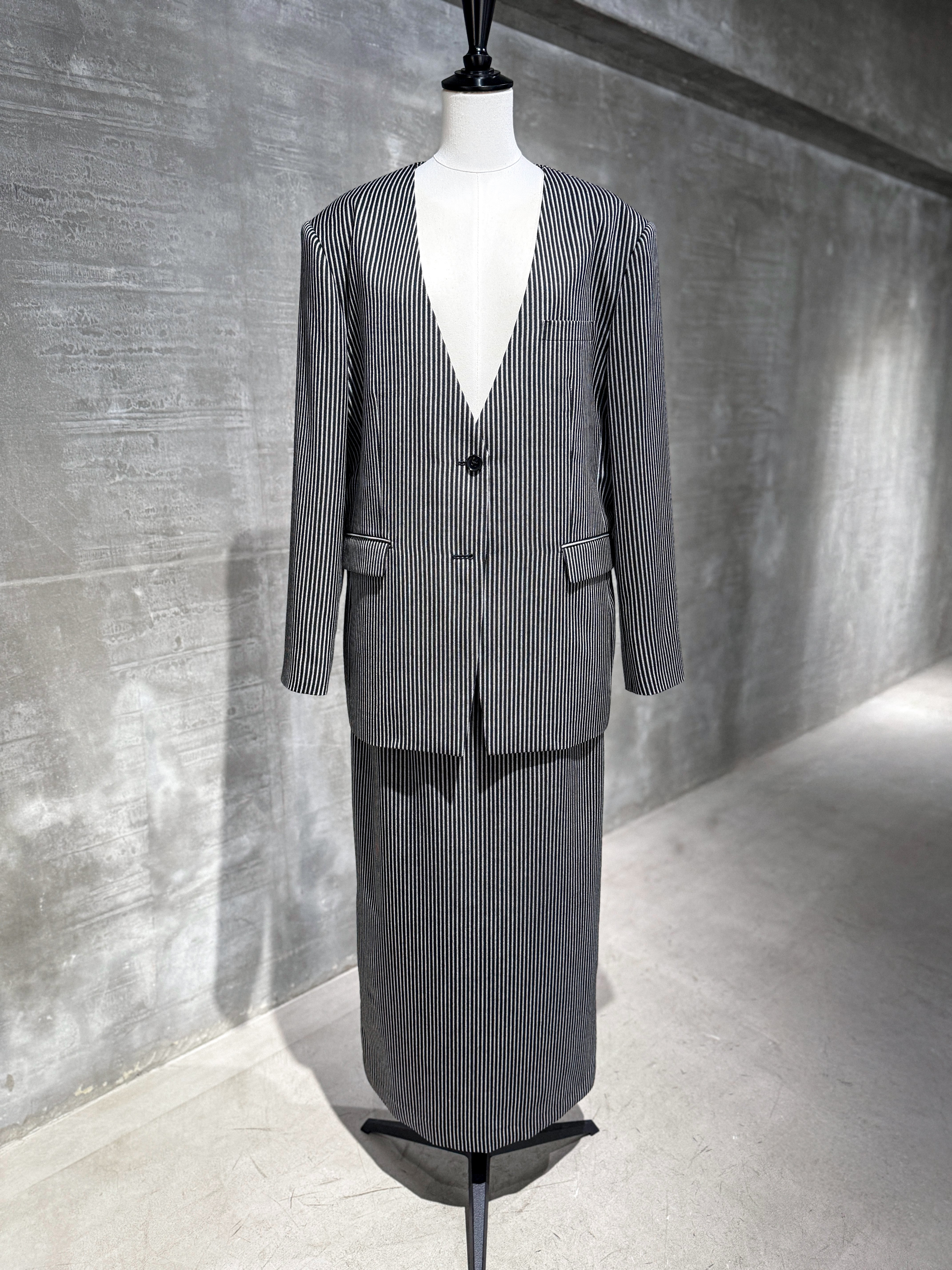 白と黒のコントラストのあるナローピッチストライプを落とし込んだオーバーサイズのノーカラージャケットとストレートスカート。デザインを極力排してシャープでエッジの効いたシルエットに仕立てています。